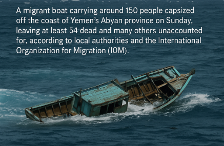 Abyan, Yemen – August 4, 2025 — A migrant boat carrying an estimated 150 people capsized off the southern coast of Yemen on Sunday, leaving at least 54 people confirmed dead and dozens more unaccounted for, according to local authorities and the International Organization for Migration (IOM).