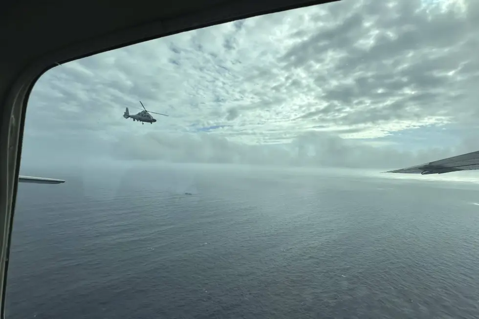 A Chinese military helicopter flies close to a Philippine Bureau of Fisheries and Aquatic (BFAR) aircraft above Scarborough shoal on Tuesday, Feb. 18, 2025. Joeal Calupitan - AP