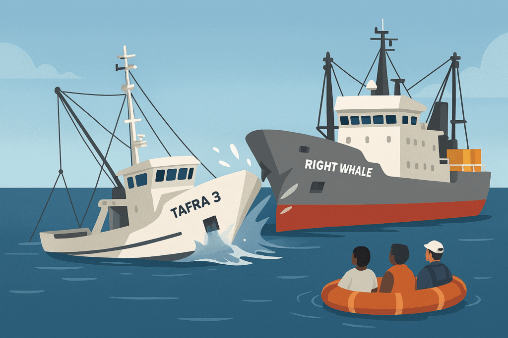 The incident occurred under calm weather and clear visibility conditions when Right Whale struck Tafra 3 on its starboard side while the Mauritanian vessel was engaged in fishing operations with its trawl cables extended. According to preliminary reports, the impact created a deep breach from the main deck through the hull, causing the freezer trawler to list to starboard before sinking stern-first in waters approximately 50 meters deep.